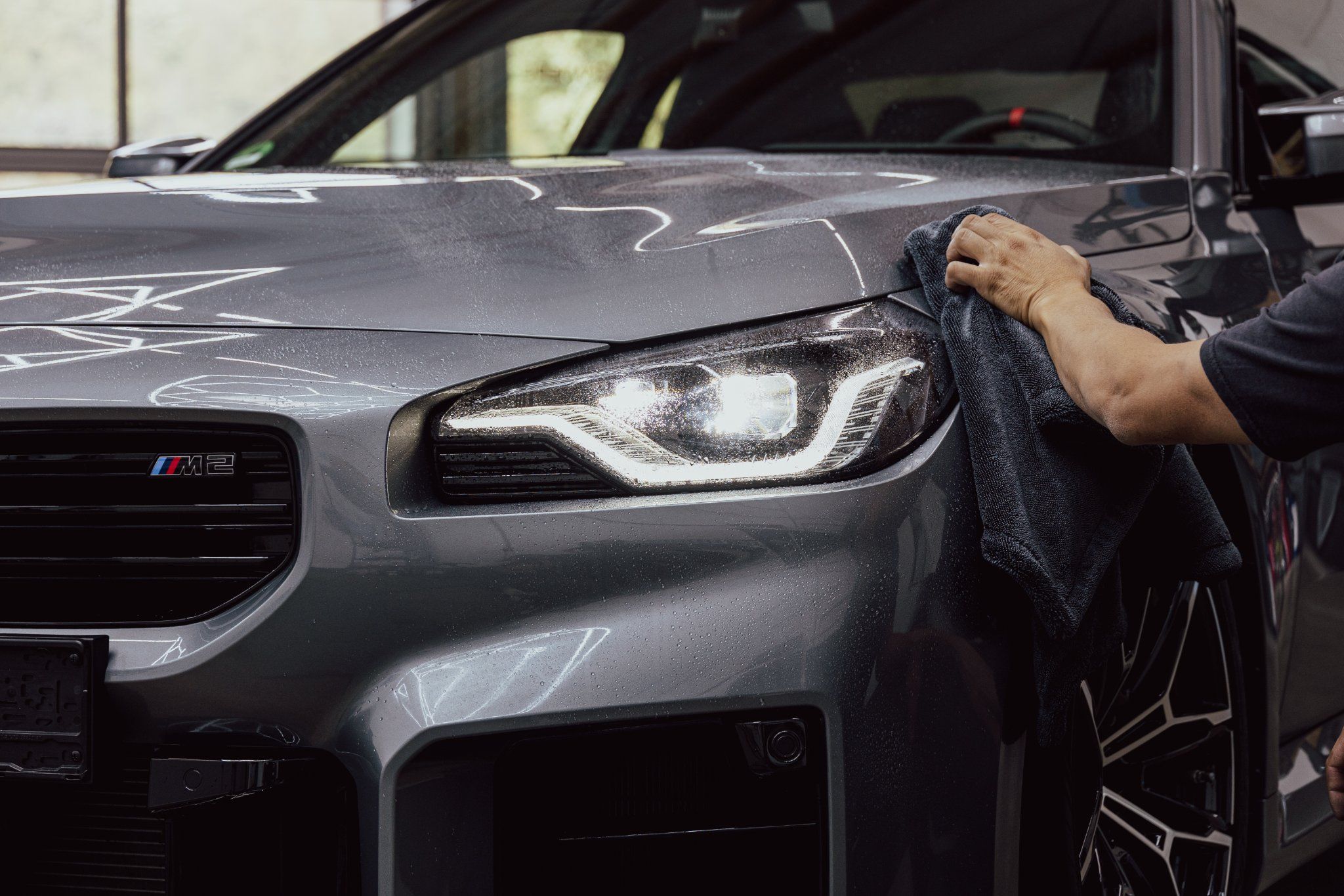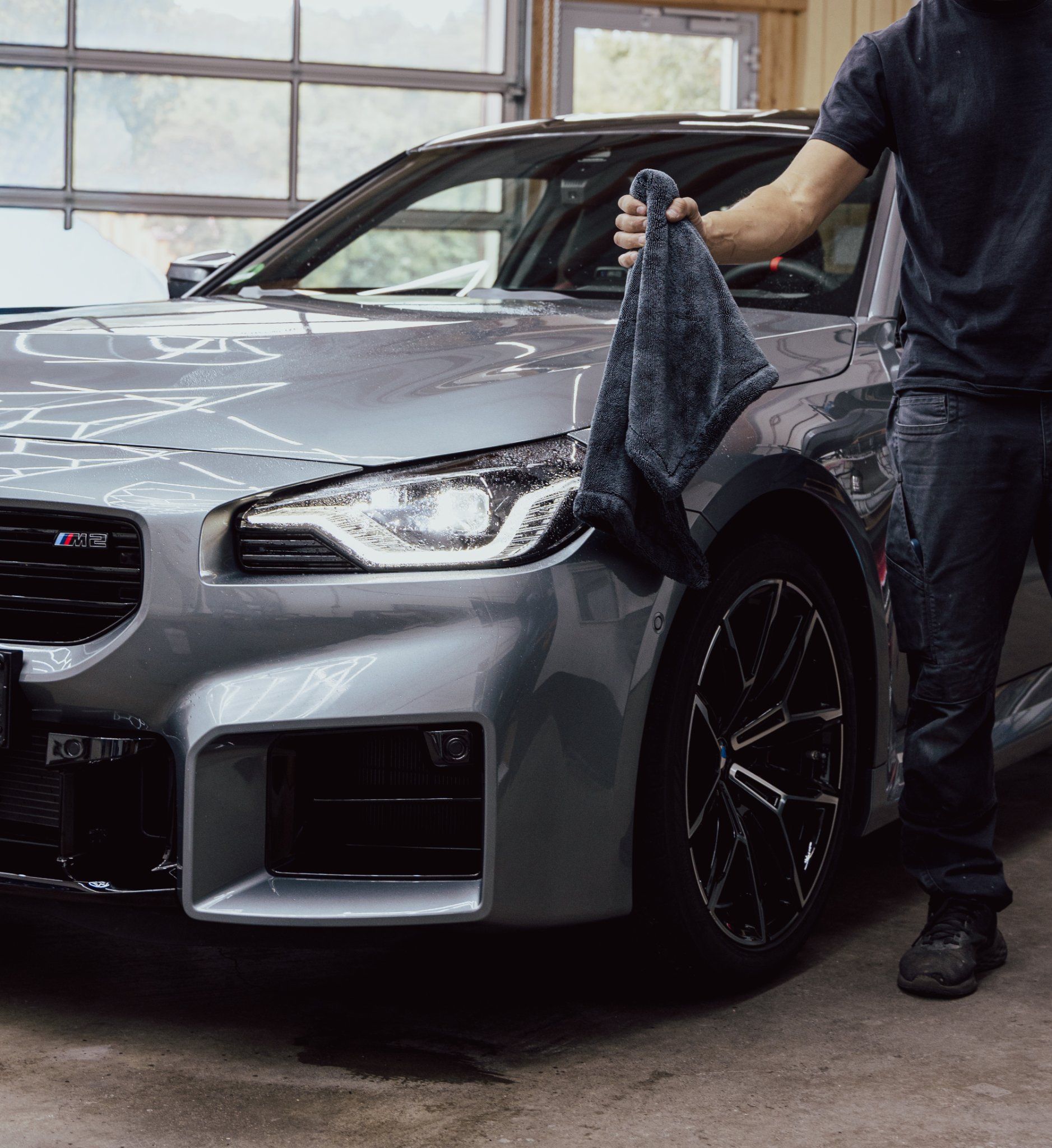 Professionelle Produktfotografie für hochwertige Microfasertücher. Die Aufnahmen setzen die Qualität, Textur und Saugfähigkeit der Tücher in einer authentischen Anwendungsumgebung in Szene. Auf einem frisch gewaschenen BMW M2 zeigen die Bilder die Premium-Qualität des Produkts im Detail - von der feinen Faserstruktur bis zur perfekten Wasseraufnahme.