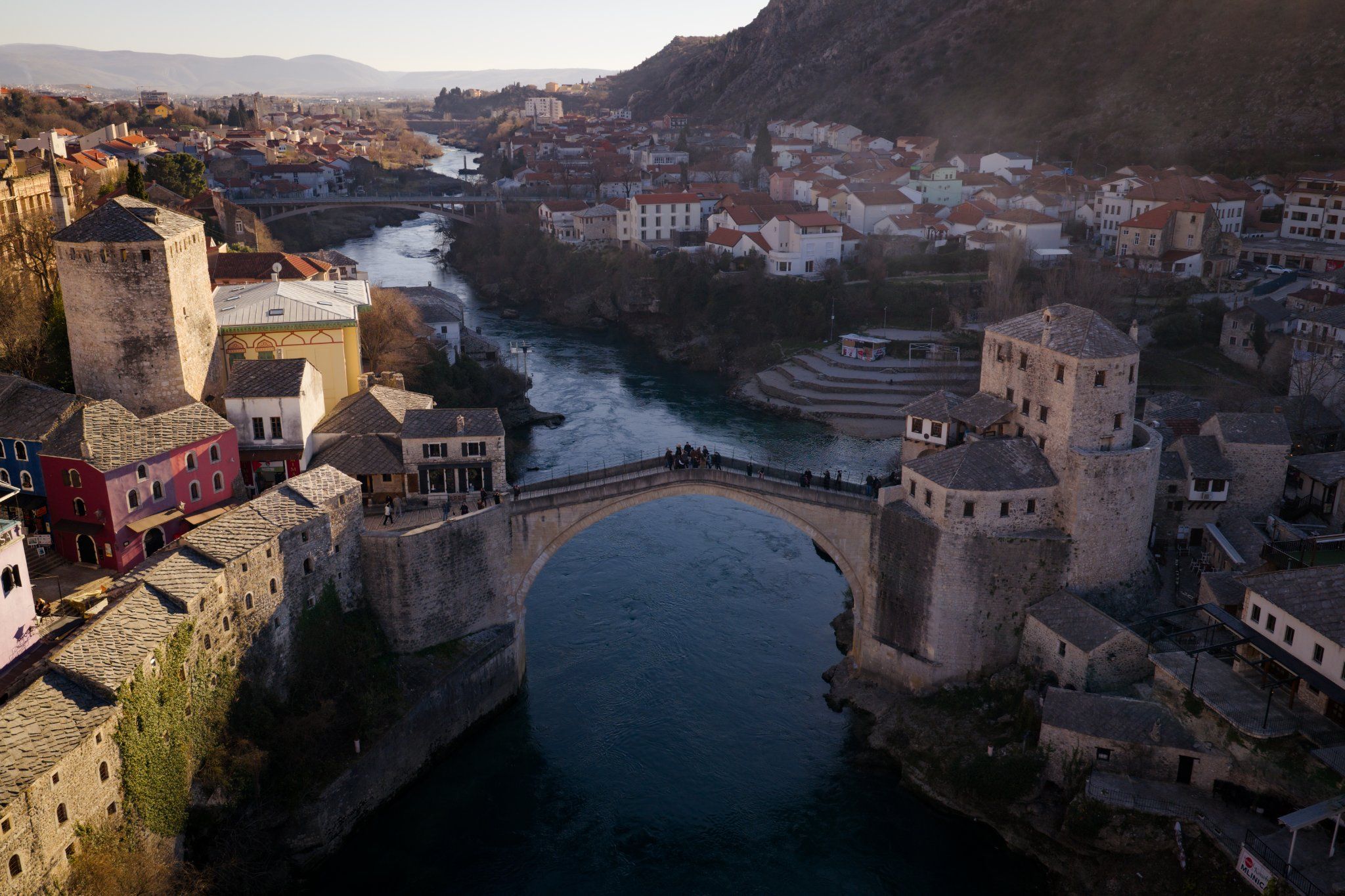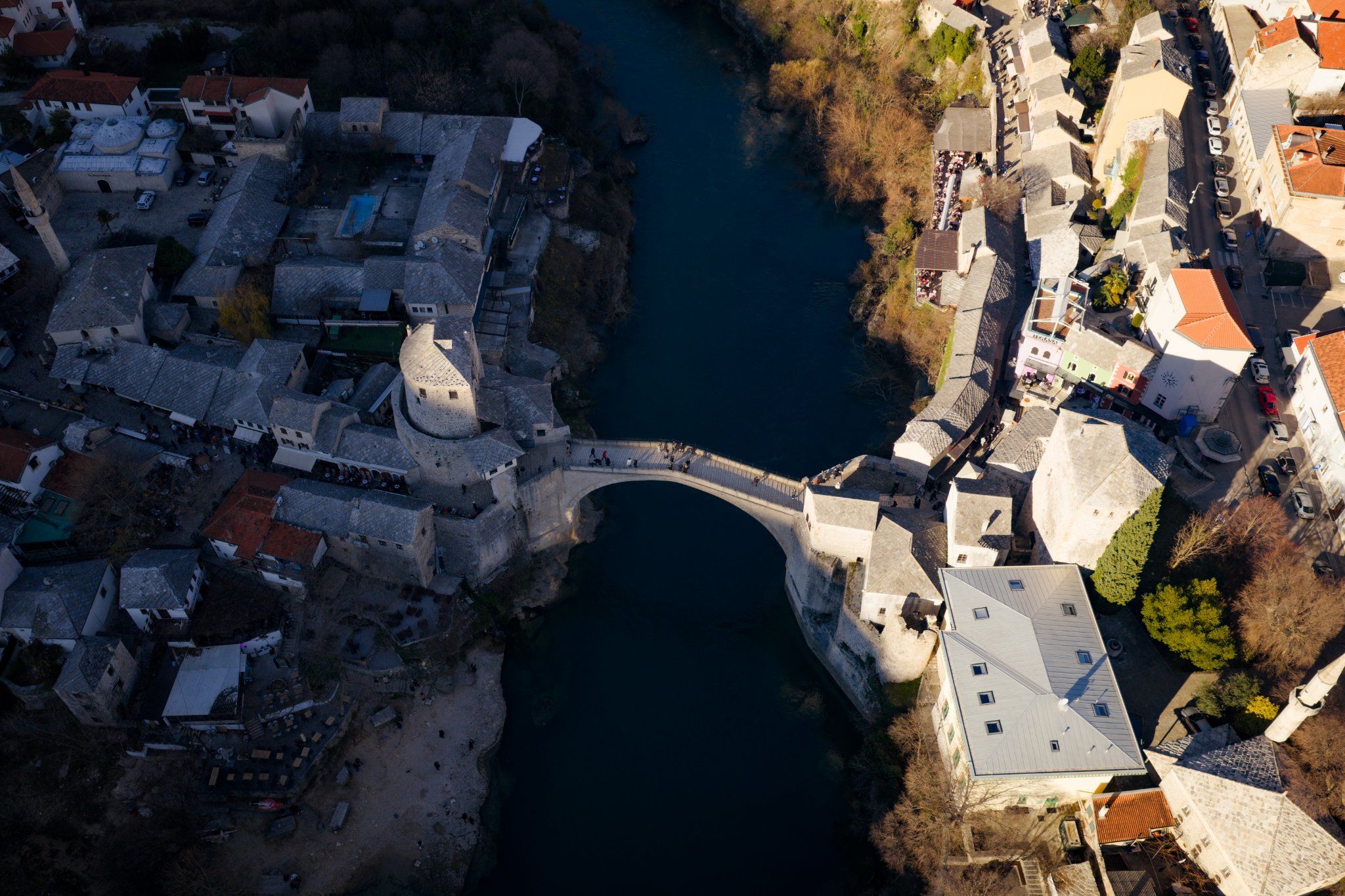 Beeindruckende Drohnenaufnahmen und Fotografie der historischen Brücke 'Stari Most' in Mostar. Dieses UNESCO-Weltkulturerbe wurde aus spektakulären Perspektiven festgehalten, die die architektonische Schönheit und die kulturelle Bedeutung dieses Wahrzeichens unterstreichen. Die Aufnahmen zeigen die Brücke und die historische Altstadt im goldenen Licht.